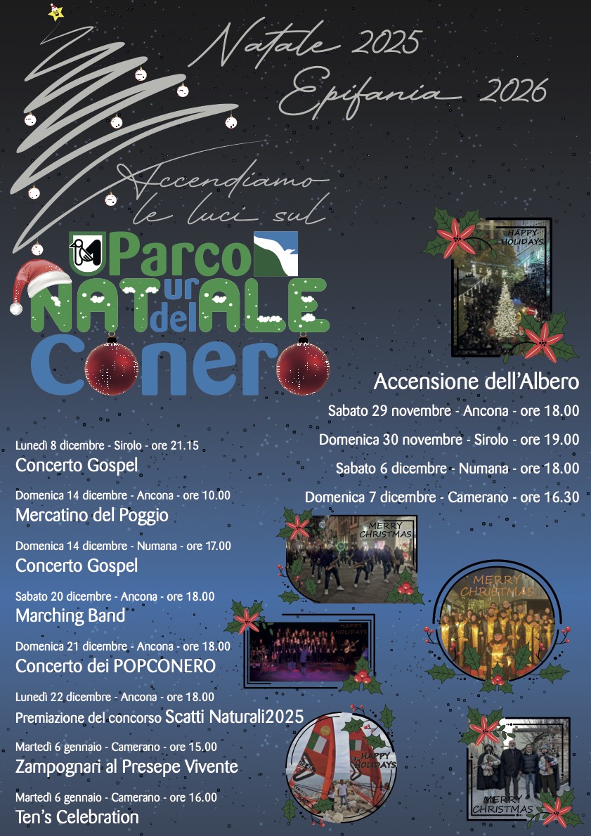 SIROLO – Eventi, concerti ma anche momenti di riflessione. Tutto questo è Parco Natale 2025, il cartellone di eventi che il Parco del Conero ha messo a punto per festeggiare le festività natalizie. “Come di tradizione essendo giunti alla 3’ edizione è un cartellone realizzato in collaborazione con le amministrazioni comunali di Ancona, Camerano, Numana e Sirolo – dice Luigi Conte Presidente dell’Ente parco – e messo a punto per integrarsi nell’offerta che ciascun comune ha previsto con l’obiettivo di rafforzare la collaborazione già forte e la riconoscibilità del brand Parco del Conero sensibilizzando ai temi della tutela dell’ambiente e della valorizzazione di questo scrigno di biodiversità”.
