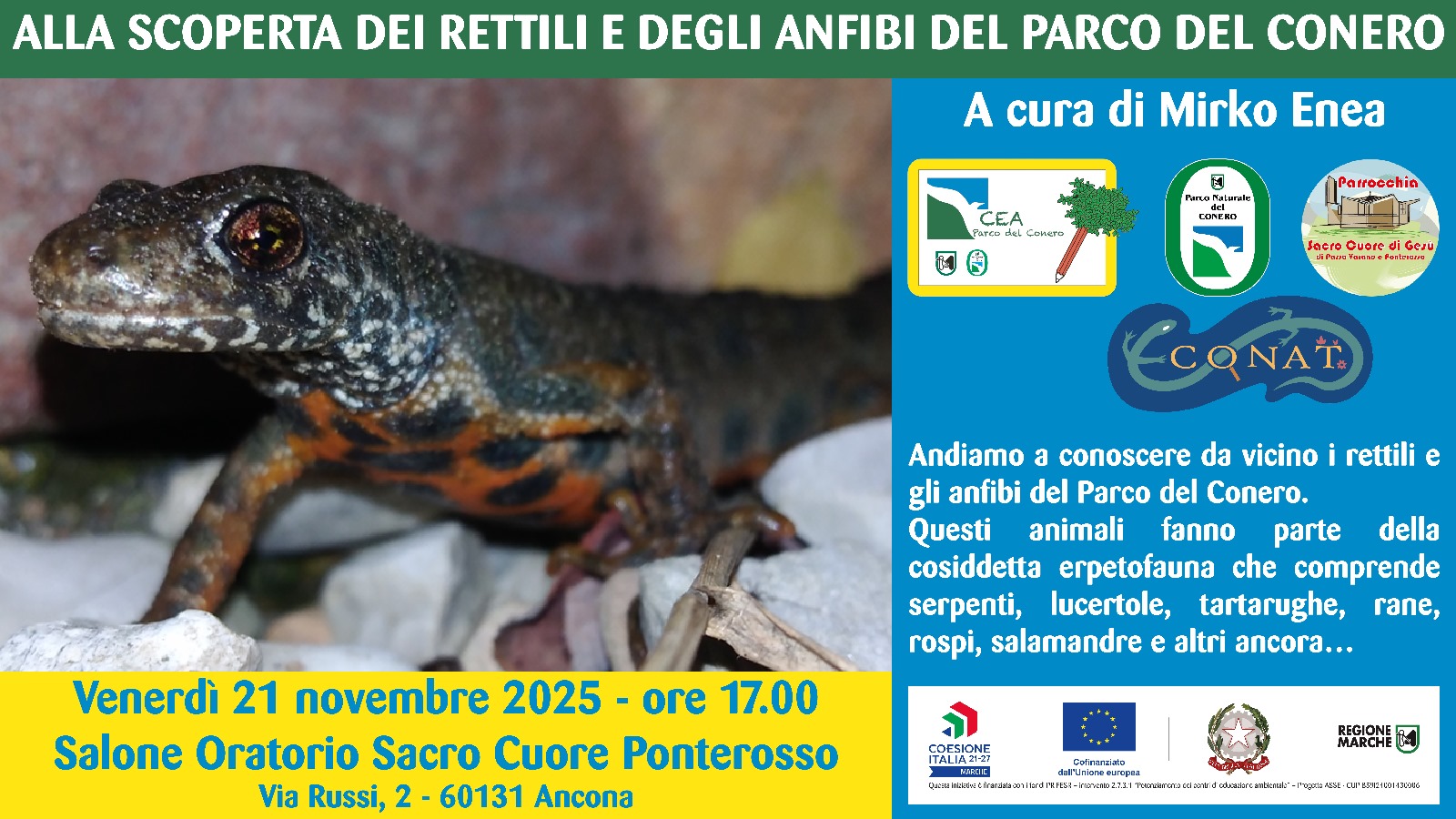 ANCONA – “Alla scoperta dei rettili e degli anfibi del Parco del Conero” è il tema dell’incontro gratuito aperto alla partecipazione di esperti ma anche di semplici appassionati fissato per venerdì 21 novembre dalle ore 17 nel salone dell’Oratorio Sacro cuore a Ponterosso in via Russi, 2.